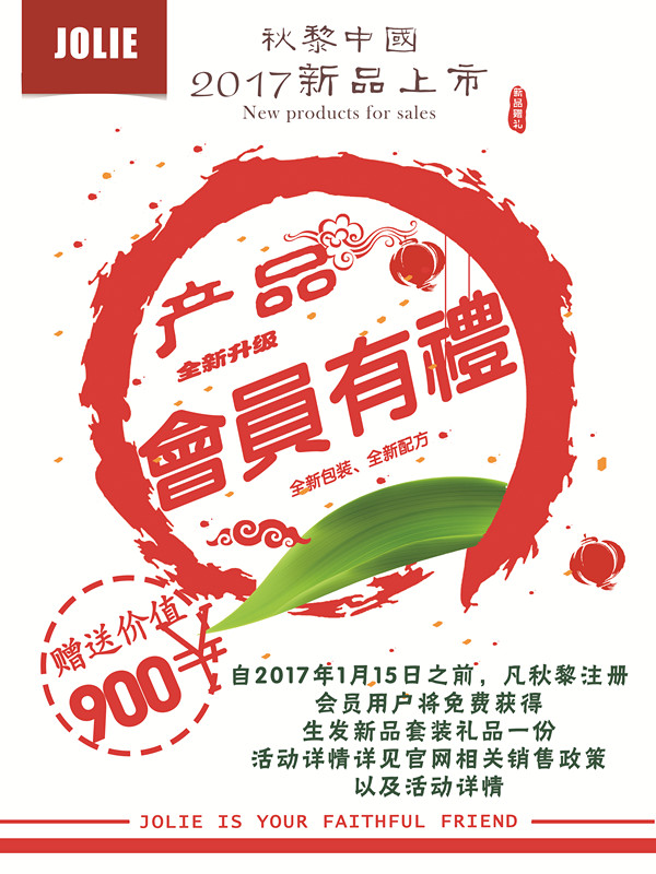 秋黎产品官网与2017年1月1日隆重推出新款秋黎毛基质防脱生发产品。根据公司客户至上宗旨,将在新品上市之际,对全体会员用户进行赠礼活动。详见活动详情彩页。